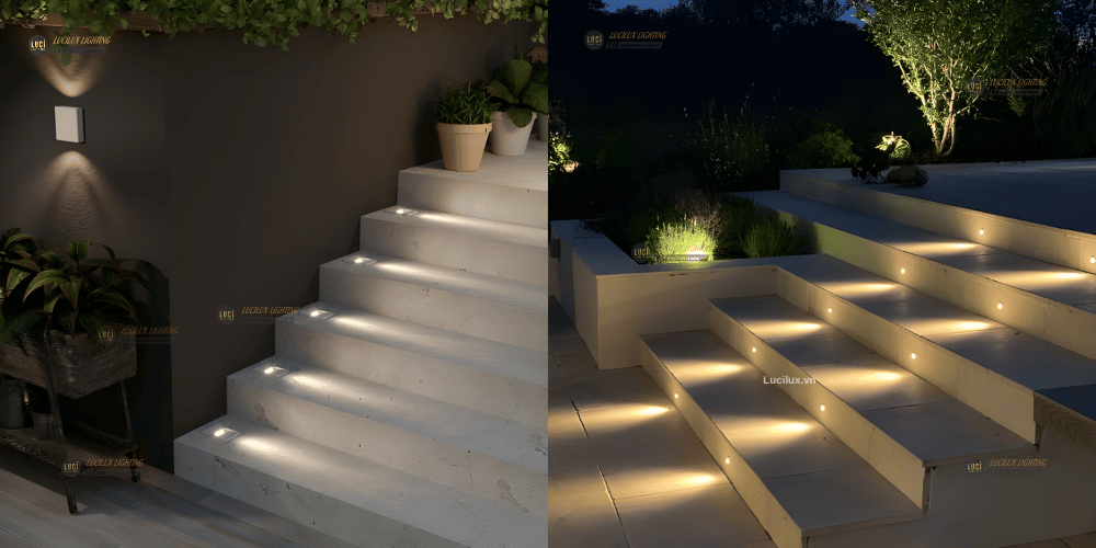 Bố trí đèn sao cho sát hai bên bậc cầu thang, với công suất phù hợp (1w, 3w, 6w). Ưu tiên lựa chọn đèn mỏng để không làm ảnh hưởng đến di chuyển và giảm khả năng vấp ngã.