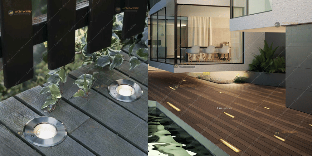 Đèn led âm đất và âm sàn hiện đang có sự ứng dụng rộng rãi trong việc chiếu sáng cho sân vườn. Có nhiều ứng dụng phổ biến mà chúng ta thường thấy, bao gồm chiếu sáng lối đi, hắt ánh sáng cây cỏ, và chiếu sáng các bức tường. Một trong những ứng dụng đặc biệt là lắp đèn led âm sàn gỗ. Bạn có thể sử dụng các mô hình đèn led âm sàn khác nhau để lắp đặt cho sàn gỗ, không chỉ bổ sung ánh sáng mà còn tạo điểm nhấn trang trí cho không gian, làm cho không gian chiếu sáng trở nên ấn tượng và sinh động hơn.