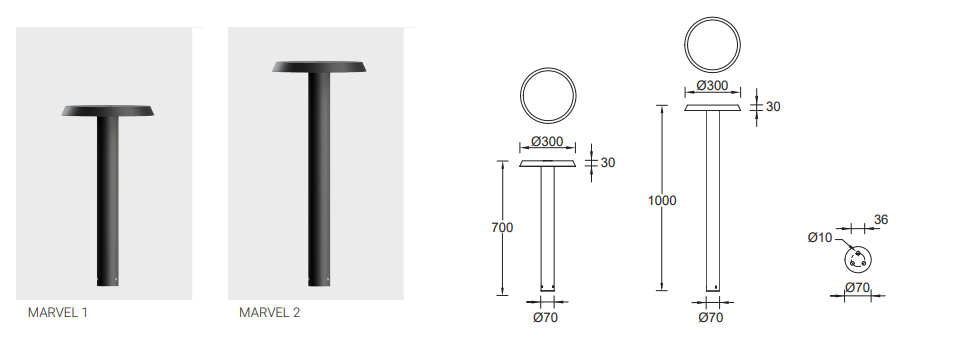 | MARVEL 1 | MAV-10004 | Ø70 - 700 mm - Optic 360° | 24 LED | 34 W | 3155 - 3321 lm | 6.0 kg | 360° | 8032 | 8040 | ND |